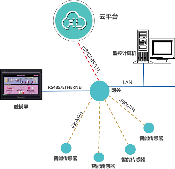 智能传感器,通过LoRa(490MHz)上传数据至物联网关